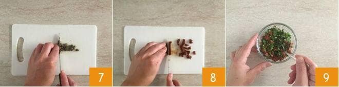 die Kapern 7 und die getrockneten Tomaten 8; geben Sie alles in eine Schüssel und mischen Sie es 9.