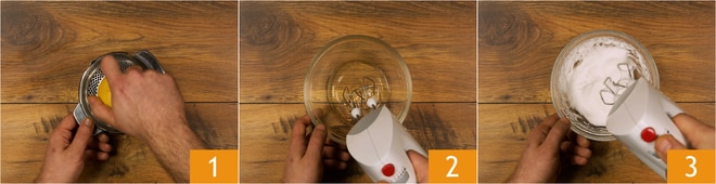 Um die Tintenfisch-Frittüre im Backteig zuzubereiten, ist der erste Schritt, die Zitrone auszupressen 1. Brechen Sie nun das Ei auf und trennen Sie das Eiweiß vom Eigelb in zwei verschiedene Schüsseln. Verwenden Sie einen elektrischen Mixer 2, um das Eiweiß steif zu schlagen 3.