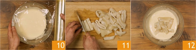 Decken Sie die Mischung mit Frischhaltefolie ab 10 und lassen Sie sie 20 Minuten im Kühlschrank ruhen. Nehmen Sie die Tintenfische und schneiden Sie sie in etwa 7 mm dicke Ringe 11. Tauchen Sie sie in den Teig 12.