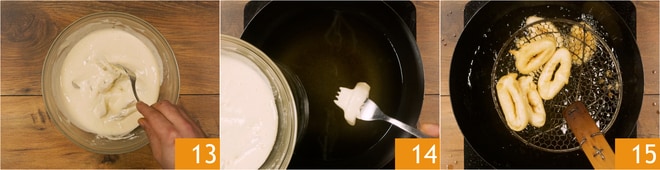 Rühren Sie gut um, um die Ringe vollständig zu bedecken 13. Erhitzen Sie das Öl in einem großen Topf auf eine Temperatur von 170°C. Verwenden Sie eine Gabel, um die Tintenfische vom überschüssigen Teig abtropfen zu lassen und tauchen Sie sie in das heiße Öl 14. Braten Sie sie 2-3 Minuten, bis sie goldbraun sind, und lassen Sie sie dann aus dem Öl abtropfen 15.
