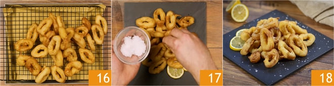 Übertragen Sie sie auf ein Gitter mit Küchenpapier darunter 16. Legen Sie sie auf einen Teller, fügen Sie einige Salzflocken hinzu 17 und servieren Sie Ihre frittierten Tintenfische im Teigmantel 18.