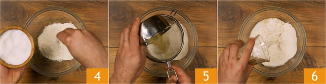 Geben Sie in eine andere Schüssel das Mehl und fügen Sie eine Prise Salz hinzu 4; filtern Sie den Zitronensaft hinein 5 und fügen Sie das Sprudelwasser hinzu 6.