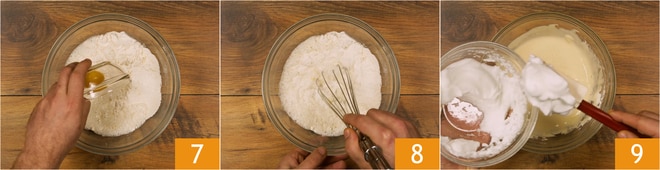Fügen Sie auch das Eigelb hinzu 7 und mischen Sie gut mit einem Schneebesen 8. Sobald Sie eine homogene Mischung erhalten haben, fügen Sie auch das steif geschlagene Eiweiß hinzu 9 und mischen Sie vorsichtig mit einem Spatel 9.