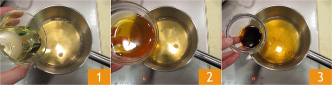 Um die gebratene Tintenfische mit Limette vorzubereiten, geben Sie Apfelessig, Wein 1, Honig 2 und Sojasoße 3 in einen kleinen Topf.