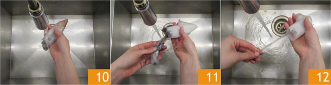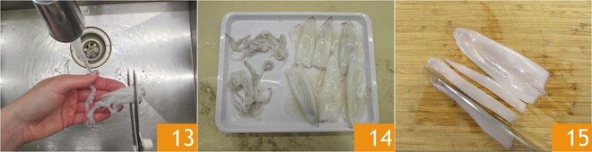 Reinigen Sie nun die Tintenfische: Waschen Sie sie unter fließendem Wasser 10, trennen Sie den Kopf und entfernen Sie die Innereien 11. Entfernen Sie auch den inneren Knochen 12 und die Haut.
