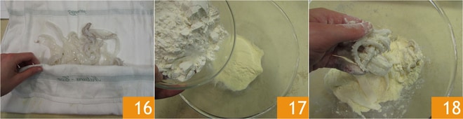Lassen Sie sie auf einem Tuch trocknen 16. Mischen Sie in einer Schüssel Mehl und Grieß 17. Mehlieren Sie die Tintenfische 18.