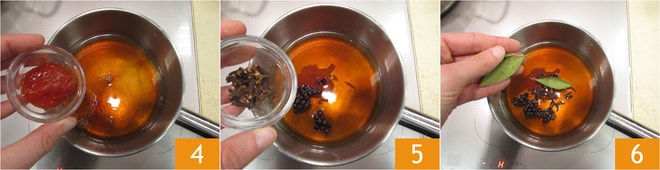 Fügen Sie auch Tomatenmark 4, Wacholderbeeren, Nelken 5 und Lorbeerblätter 6 hinzu.