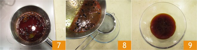 Erhitzen Sie alle Zutaten 7 und lassen Sie das Produkt etwa eine Stunde lang um ein Viertel reduzieren. Filtern Sie die erhaltene Soße durch ein Sieb 8 und stellen Sie sie beiseite 9.