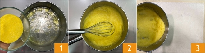 Um den gebratenen Kabeljau mit Avocadocreme zuzubereiten, bereiten Sie zuerst die Polenta für die Chips vor: Bringen Sie in einem kleinen Topf das Wasser mit einem Schuss Öl und einer Prise Salz zum Kochen, dann gießen Sie nach und nach das Maismehl ein, während Sie mit einem Schneebesen rühren 1. Senken Sie die Hitze leicht und lassen Sie die Mischung eindicken, während Sie weiter mit dem Schneebesen rühren 2. Sobald die richtige Konsistenz erreicht ist, geben Sie die Polenta in die Mitte eines Blattes Backpapier 3.