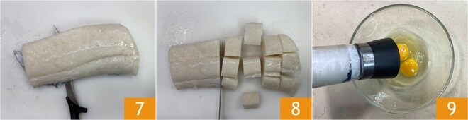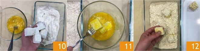 Wenden Sie die Stücke zuerst im Mehl, wobei Sie das Überschüssige entfernen 10, dann im Ei 11 und schließlich im Panko 12.