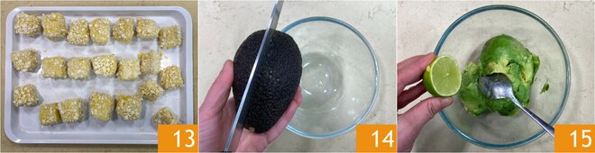 Während Sie den Kabeljau panieren, legen Sie die Stücke auf ein Tablett 13. Stellen Sie das Tablett in den Kühlschrank und kümmern Sie sich um die Avocadocreme: Teilen Sie die Avocado in zwei Hälften 14, entnehmen Sie das Fruchtfleisch und geben Sie es in eine Schüssel, dann fügen Sie den Limettensaft hinzu 15.