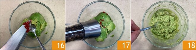 Fügen Sie auch die gehackte und entkernte Chilischote hinzu 16, Salz und Pfeffer 17. Zerdrücken Sie alles mit einer Gabel, um es zu einer Creme zu machen 18. Legen Sie auch die Avocadocreme mit Frischhaltefolie bedeckt in den Kühlschrank.