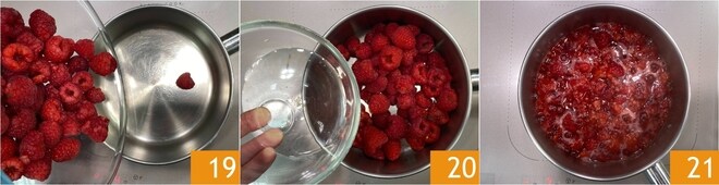 Bereiten Sie zuletzt die Himbeersauce zu: Geben Sie die Himbeeren in einen kleinen Topf 19, fügen Sie einen Schuss Wasser hinzu 20 und lassen Sie sie etwa 5 Minuten bei mittlerer Hitze kochen 21.