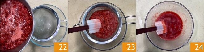 Wenn die Himbeeren weich geworden sind, geben Sie sie in ein Sieb, das über einer Schüssel positioniert ist 22, und drücken Sie mit einem Spatel, um sie zu passieren und die Kerne zu entfernen 23 24.