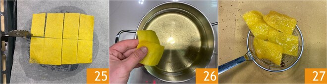 Sie sind bereit zum Frittieren: Nehmen Sie die Polenta und schneiden Sie sie in Rechtecke 25. Erhitzen Sie das Pflanzenöl auf eine Temperatur von 180° und frittieren Sie wenige Stücke gleichzeitig bis zur goldbraunen Farbe 26, dann auf Küchenpapier abtropfen lassen 27.