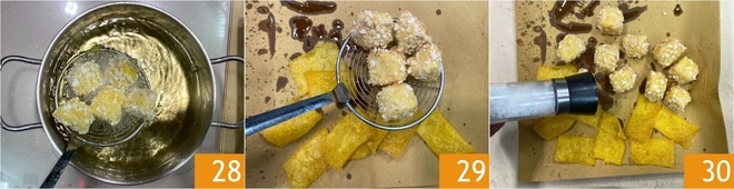 Frittieren Sie im gleichen Öl auch die Kabeljaustücke 28 und lassen Sie sie, sobald sie goldbraun sind, ebenfalls auf Küchenpapier abtropfen 29. Nach Belieben salzen 30.