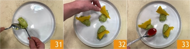 Jetzt können Sie anrichten: Formen Sie mit Hilfe von 2 Teelöffeln kleine Nocken aus Avocadocreme 31, dann fügen Sie die Polenta-Chips hinzu 32 und einige Tropfen Himbeersauce 33.