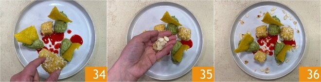 Vervollständigen Sie mit gerösteten Mandelblättchen 34 und einigen Thymian- und Majoranblättern. Wenn Sie möchten, können Sie nach Belieben mit essbaren Blumen garnieren 35. Ihr gebratener Kabeljau mit Avocadocreme ist bereit zum Servieren 36!