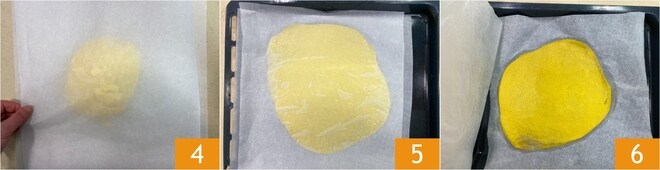 Bedecken Sie sie mit einem weiteren Blatt Backpapier 4 und rollen Sie die Polenta mit einem Nudelholz sehr dünn aus. Übertragen Sie alles auf ein Backblech 5 und backen Sie es im vorgeheizten Umluftofen bei 180° für etwa 30 Minuten. Nach dieser Zeit aus dem Ofen nehmen und abkühlen lassen 6.