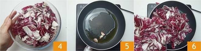Waschen Sie den Radicchio unter fließendem Wasser 4. Wenn Sie die bittere Note mildern möchten, können Sie ihn 30 Minuten lang mit einer Prise Salz einweichen lassen, andernfalls überspringen Sie diesen Schritt. In einer antihaftbeschichteten Pfanne die ungeschälten Knoblauchzehen mit dem Öl anbraten 5, dann den gut abgetropften Radicchio hinzufügen 6.