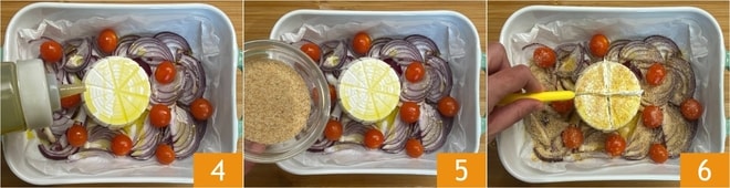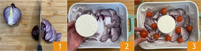 Um den gebackenen Ricotta zuzubereiten, lassen Sie zuerst den Ricotta etwa zehn Minuten in einem Sieb abtropfen. In der Zwischenzeit schälen Sie die Zwiebel und schneiden sie in dünne Scheiben 1. Legen Sie eine Auflaufform mit Backpapier aus, verteilen Sie die Zwiebeln auf dem Boden und legen Sie den Ricotta in die Mitte 2, dann fügen Sie die ganzen Tomaten hinzu 3.