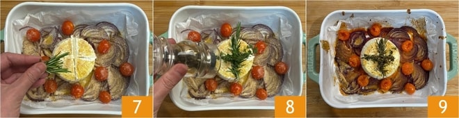 Zum Schluss mit Rosmarinzweigen 7 und Thymian würzen. Fügen Sie etwas Pfeffer hinzu 8 und noch einen Schuss Öl, dann backen Sie in einem vorgeheizten statischen Ofen bei 200° für etwa 30 Minuten. Herausnehmen und sofort Ihren gebackenen Ricotta servieren 9!