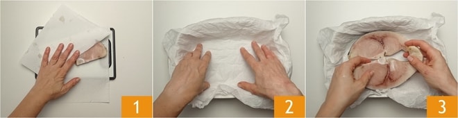 Um den Schwertfisch im Ofen mit Garmethode im Backpapier zuzubereiten, trocknen Sie zuerst die Schwertfischscheiben gut mit Küchenpapier ab 1. Befeuchten und wringen Sie das Backpapier aus und legen Sie es in eine ausreichend große Auflaufform 2, dann legen Sie die Schwertfischscheiben hinein 3.