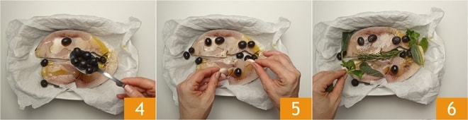 Das Garen im Ofen macht den Fisch leicht, aber gleichzeitig schmackhaft, dank der Zugabe einer Handvoll Oliven und Aromen, die im Backpapier ihre Düfte entfalten.