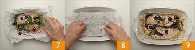 Gießen Sie den Weißwein ein 7, dann schließen Sie das Backpapier, um die Fischscheiben einzuwickeln 8. In der Zwischenzeit heizen Sie den Umluftofen auf 180°C vor, dann backen Sie den Schwertfisch 25 Minuten lang. Nehmen Sie die Auflaufform aus dem Ofen und schalten Sie die Grillfunktion ein. Entfernen Sie das Backpapier, um ein Verbrennen zu vermeiden, und backen Sie den Fisch weitere 5 Minuten, bis er goldbraun ist. Lassen Sie den Ofenschwertfisch einige Minuten ruhen, bevor Sie ihn servieren 9!