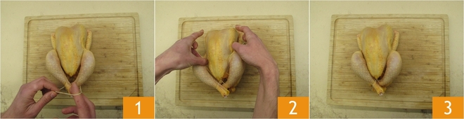 Um das Brathähnchen zuzubereiten, binden Sie zuerst das Hähnchen, damit es nach dem Garen seine Form behält. Nehmen Sie ein Backgummiband, wickeln Sie es um das Ende der Schenkel 1, dehnen Sie es und führen Sie es hinter die Brust 2, um es zu fixieren 3.