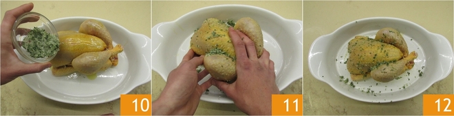 Bedecken Sie es mit der Kräutermischung 10, indem Sie es mit beiden Händen auf allen Seiten einmassieren, damit es gut haftet 11. Würzen Sie auch das Innere des Hähnchens mit der Kräutermischung 12.