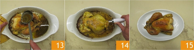 Garen Sie das Hähnchen in einem vorgeheizten statischen Ofen bei 180 °C etwa eine Stunde lang. Begießen Sie das Hähnchen von Zeit zu Zeit mit dem Bratensaft 13. Nehmen Sie das Hähnchen zur Hälfte der Garzeit aus dem Ofen und drehen Sie es auf die andere Seite 14, damit es gleichmäßig von beiden Seiten gart. Fahren Sie mit dem Garen fort, indem Sie das Hähnchen von Zeit zu Zeit mit dem Bratensaft begießen. Nach der Garzeit aus dem Ofen nehmen und Ihr Hähnchen servieren 15. Um sicherzustellen, dass es gut durchgegart ist, können Sie die Temperatur in der Mitte des Schenkels messen, sie sollte bei 72 °C liegen.