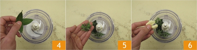Geben Sie das grobe Salz in einen Mixer, fügen Sie das Lorbeerblatt 4 und die anderen Kräuter hinzu: Rosmarin, Salbei und frischen Oregano 5. Geben Sie auch 2 geschälte Knoblauchzehen hinzu 6.