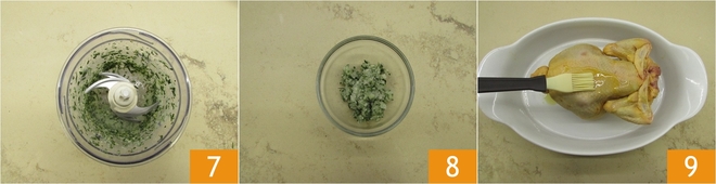 Mixen Sie alles 7 und geben Sie die Mischung in eine kleine Schüssel 8. Nehmen Sie das Hähnchen und legen Sie es in eine Ofenform. Bestreichen oder massieren Sie beide Seiten der Hähnchenoberfläche mit Olivenöl extra vergine 9.