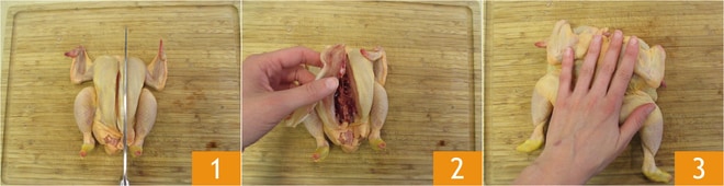 Um das gebratene Hähnchen zuzubereiten, nehmen Sie das ganze Hähnchen, legen Sie es mit der Brust nach oben auf ein Schneidebrett und schneiden Sie es an beiden Seiten des Rückenmarks auf 1. Dann geben Sie ein paar Schläge, um den Knochen zu brechen. Öffnen Sie dann das Hähnchen und entfernen Sie den Knochen 2. Drehen Sie es um und drücken Sie es leicht mit den Händen flach 3.