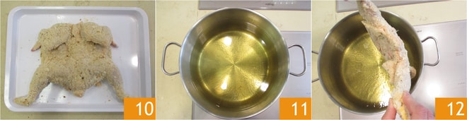 Legen Sie das Hähnchen auf ein sauberes Tablett 10 und lassen Sie es für mindestens 30 Minuten im Kühlschrank, dieser Schritt hilft, die Panade besser haften zu lassen. In der Zwischenzeit erhitzen Sie das Öl 11, es sollte 170 Grad erreichen, die perfekte Temperatur zum Frittieren. Nach der erforderlichen Zeit tauchen Sie das Hähnchen in das Öl 12 und lassen es ca. 5 Minuten auf einer Seite braten, ohne es zu bewegen, dann drehen Sie es und lassen es braten, bis es komplett goldbraun und knusprig ist.