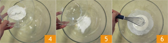 Jetzt bereiten Sie den Teig vor: Geben Sie das Mehl 4 und das Wasser 5 in eine Schüssel, und rühren Sie mit einem Schneebesen, bis eine gut vermengte Masse entsteht 6.