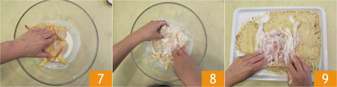 Tauchen Sie das Hähnchen ein 7 und bewegen Sie es gut, damit der Teig es vollständig bedeckt 8. Wälzen Sie es dann in den Semmelbröseln 9, die Sie zuvor auf einem Tablett verteilt haben, und achten Sie darauf, dass keine Stelle unbedeckt bleibt.