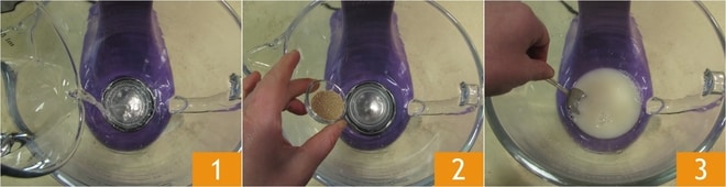 Um die Mantou zuzubereiten, geben Sie das Wasser in die Schüssel einer Küchenmaschine mit Knethaken 1, fügen Sie die Trockenhefe hinzu 2 und rühren Sie kurz mit einem Löffel um, um sie aufzulösen 3.