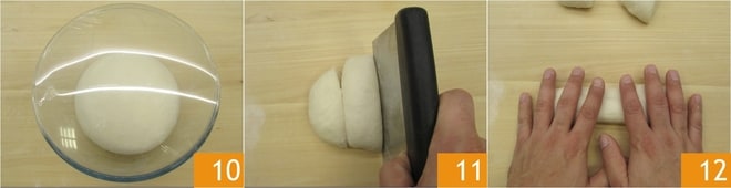 Nach der Gehzeit 9 geben Sie den Teig auf die mit wenig Mehl bestreute Arbeitsfläche und drücken ihn leicht mit den Fingern flach. Teilen Sie den Teig mit Hilfe eines Teigschabers in 3 Portionen 10 und formen Sie dann Stangen 12.