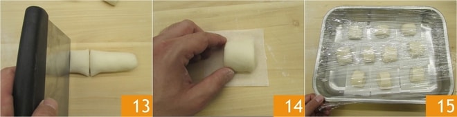 Entfernen Sie die Enden der Stangen mit dem Teigschaber, schneiden Sie dann Stücke mit einem Gewicht von etwa 30-40 g 13. Glätten Sie die Ränder des Teigs, um eine rechteckige Form zu erhalten, und legen Sie dann jedes Stück auf ein Quadrat Backpapier 14. Legen Sie die Brötchen mit ihrer Backpapierunterlage auf ein Tablett, bedecken Sie es mit Frischhaltefolie und lassen Sie sie weitere 40 Minuten bei Raumtemperatur gehen 15.