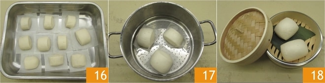 Nach dieser Zeit sind Sie bereit zum Garen 16: Bringen Sie das Wasser im Dampfgarer zum Kochen, legen Sie die Brötchen hinein und schließen Sie den Deckel. Dämpfen Sie sie für 8-9 Minuten, dann schalten Sie das Feuer aus und lassen Sie sie ein paar Minuten mit geschlossenem Deckel ruhen: So wird der Teig nicht reißen, sondern schön glatt bleiben 17. Servieren Sie Ihre Mantou im typischen Bambuskörbchen 18!