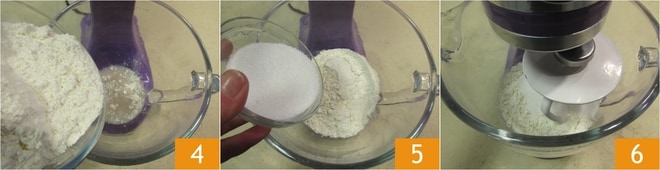 Fügen Sie das Weizenmehl 4 und den Zucker 5 hinzu und schalten Sie die Küchenmaschine für 5-6 Minuten auf niedrigster Geschwindigkeit ein 6.
