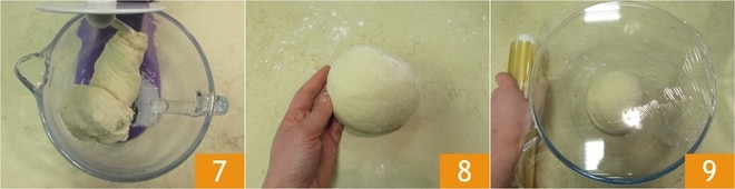 Wenn die Masse kompakt ist 7, geben Sie sie auf eine leicht bemehlte Arbeitsfläche und kneten sie kurz, um eine runde und glatte Form zu erhalten 8. Geben Sie den Teig in eine Schüssel, bedecken Sie ihn mit Frischhaltefolie 9 und lassen Sie ihn bei Raumtemperatur etwa 40 Minuten ruhen.
