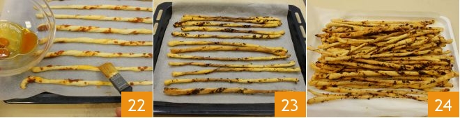 Wiederholen Sie den Vorgang und legen Sie die Grissini nebeneinander auf ein mit Backpapier ausgelegtes Blech: Mit diesen Mengen sollten Sie 60 Grissini erhalten. Bestreichen Sie das erste Blech mit dem Öl der Tomatencreme, das Sie beiseite gelegt haben 22 und backen Sie im vorgeheizten statischen Ofen bei 180° für 20 Minuten (bei 160° für 13-15 Minuten im Umluftofen), bis sie gut gebräunt sind 23. Sobald sie fertig sind, nehmen Sie sie aus dem Ofen, legen sie auf ein mit Backpapier ausgelegtes Tablett und fahren dann mit den anderen Grissini fort. Lassen Sie sie vollständig abkühlen und schließlich können Sie die gedrehten Grissini servieren und genießen 24.