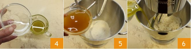 Vermischen Sie das Wasser mit dem Salz mit dem Öl 4 und rühren Sie um. Geben Sie in die Schüssel einer Küchenmaschine mit Blatt den Mehl mit der Hefe und das Wasser mit dem Malz 5, dann starten Sie das Blatt und geben Sie das Öl nach und nach hinzu 6.