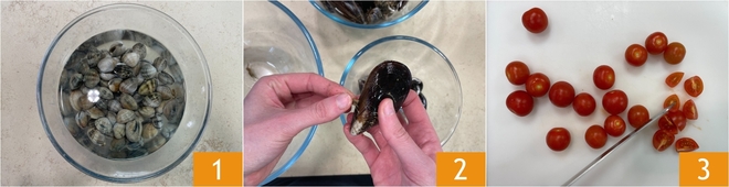 Um das Sauté zuzubereiten, legt ihr zuerst die Venusmuscheln in Wasser mit Salz und lasst sie ein paar Stunden 1 einweichen. Dann die Venusmuscheln abgießen und unter fließendem Wasser abspülen, anschließend jede einzeln auf einem Schneidebrett leicht anklopfen, um vorhandenen Sand zu kontrollieren und beschädigte Exemplare zu entfernen. Nach der Wie man Venusmuscheln reinigt geht es an die Wie man Miesmuscheln reinigt und öffnet: unter fließendem Wasser abspülen, dann den Byssus (Bart) von den Schalen abreißen 2 und gründlich mit einem Stahlwollpad oder einer steifen Bürste schrubben. Abschließend die Kirschtomaten vierteln 3.