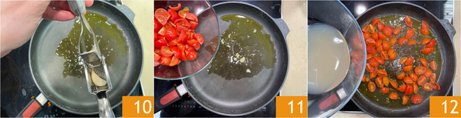In derselben Pfanne einen Schuss Öl geben und die Knoblauchzehen andrücken 10. Kurz anschwitzen lassen, dann die Kirschtomaten hinzufügen 11 und 1–2 Minuten bei schwacher Hitze braten. Anschließend den Kochsaft der Schalentiere dazugießen 12 und nach Geschmack pfeffern.
