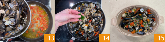 Miesmuscheln und Venusmuscheln ebenfalls hinzufügen 13 und ein paar Minuten ziehen lassen. Herd ausschalten und mit gehackter Petersilie verfeinern 14. Euer Sauté aus Miesmuscheln und Venusmuscheln ist nun servierfertig, garniert mit zusätzlicher frischer Petersilie 15!