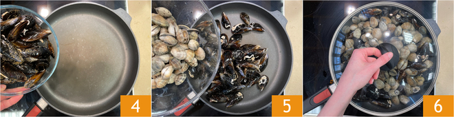 Jetzt eine große Pfanne gut erhitzen, dann die Miesmuscheln 4 und die Venusmuscheln 5 dazugeben. Sofort mit dem Deckel abdecken 6 und bei starker Hitze nur so lange garen, bis sie sich öffnen.